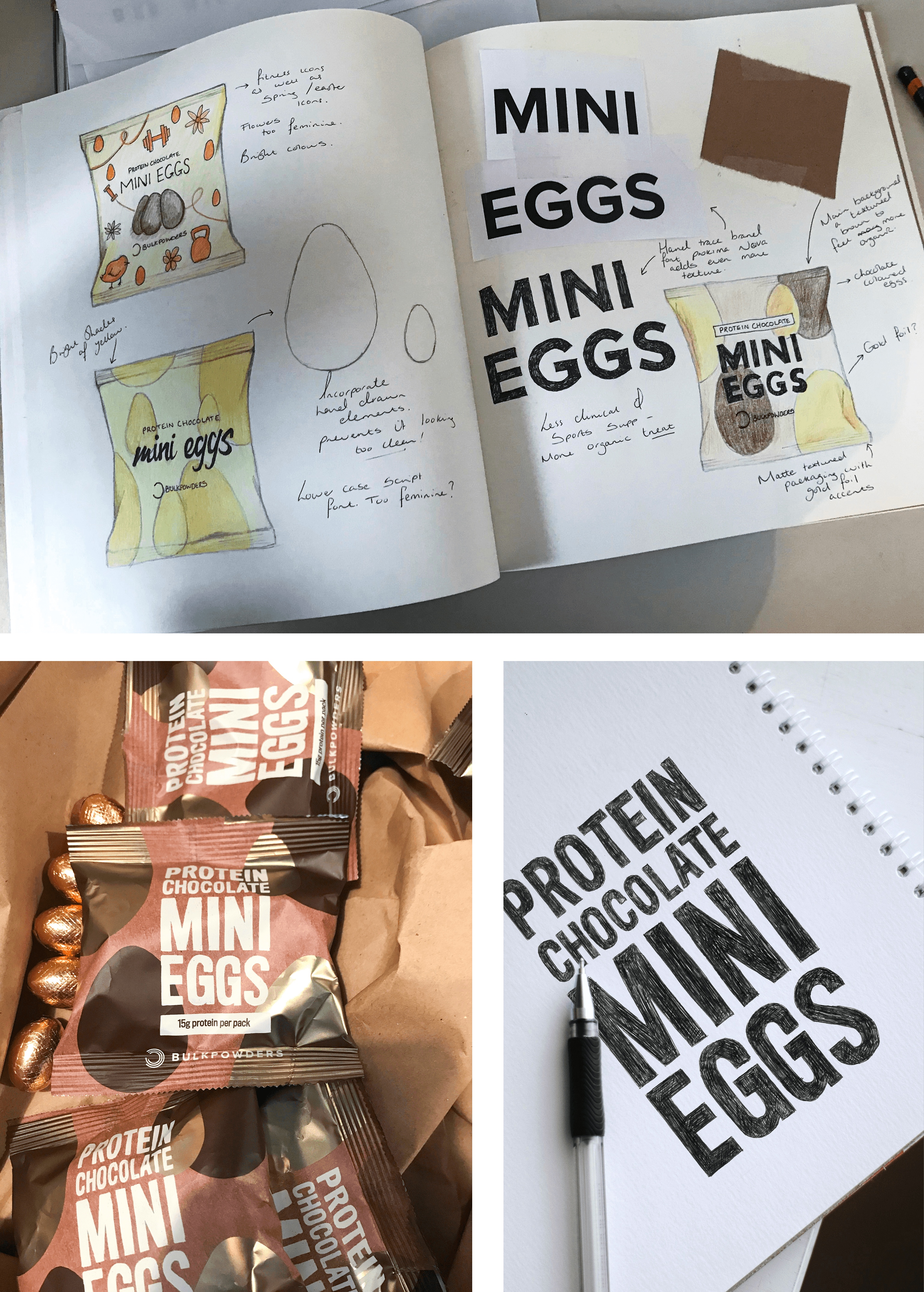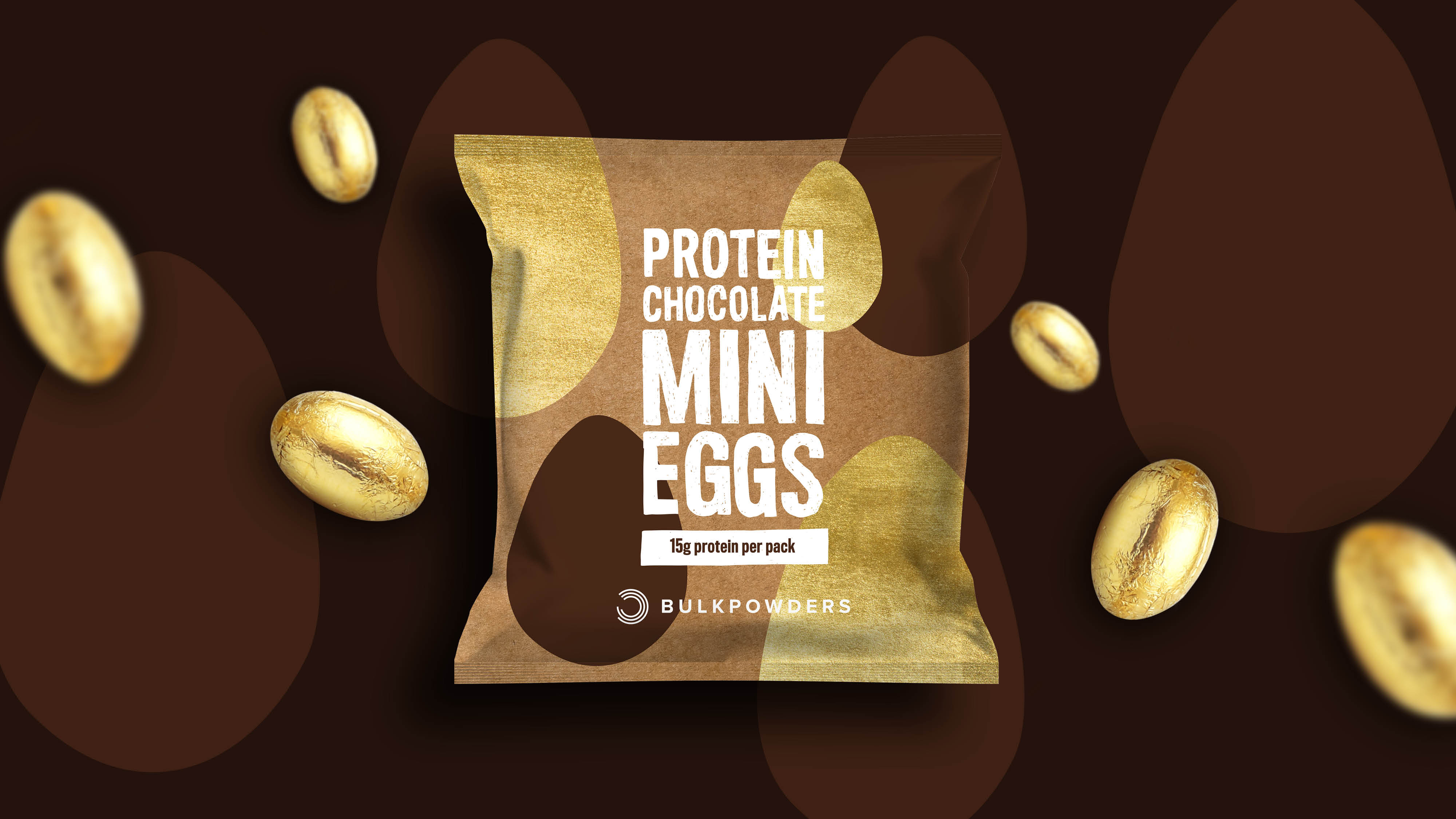 The Bulk Powders protein chocolate mini eggs were a limited-edition Easter product. The design incorporated hand-lettered text (based on the new font introduced on the flapjack range) alongside hand-drawn egg shapes with gold detailing to emphasise its one-off celebratory feel. The product proved hugely popular and sold out within just a few days.