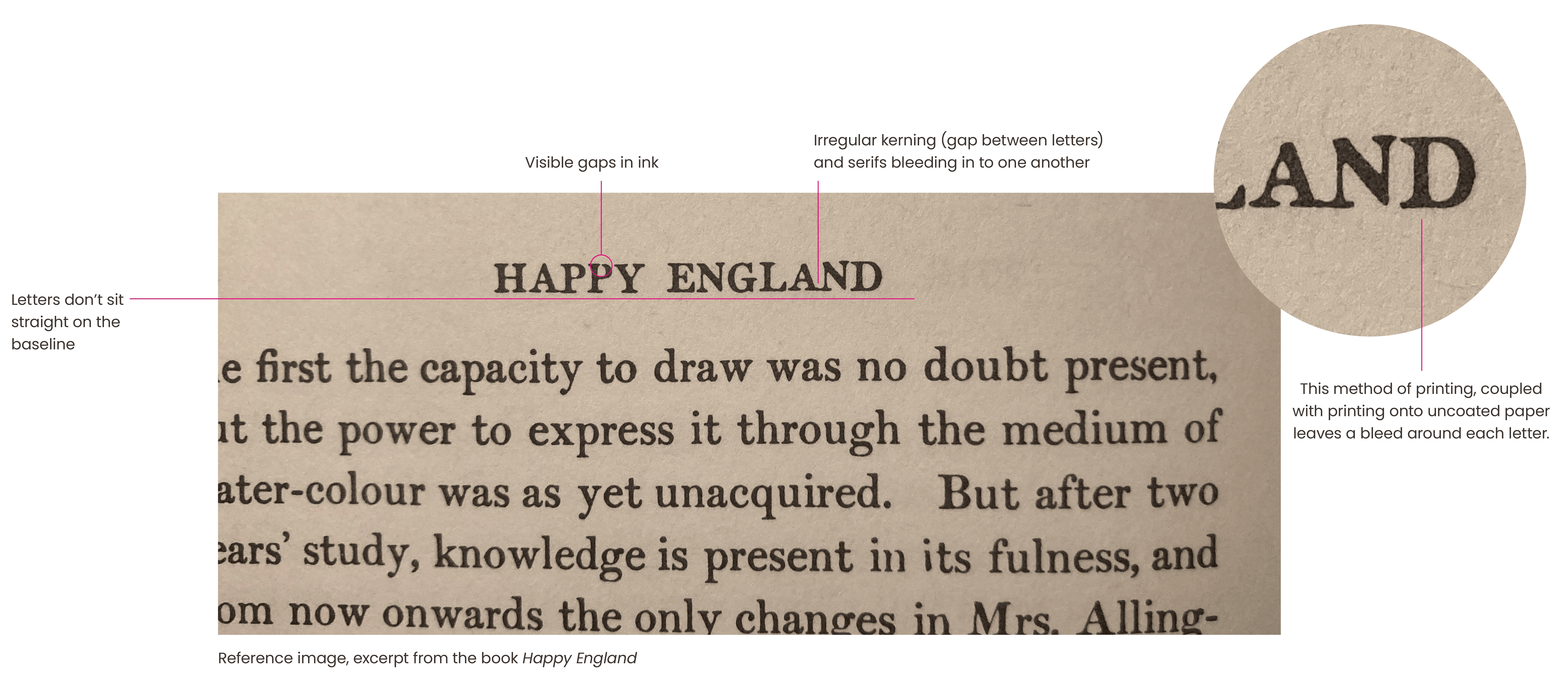 Dominic approached me to develop an identity that reflected the aesthetic of a bygone English era, referencing the printed pages of the book Happy England, published in 1903. Using letter forms from the Baskerville font, I deliberately misaligned the letters and added a bleed to mimic rudimentary printing techniques of the early 1900s.